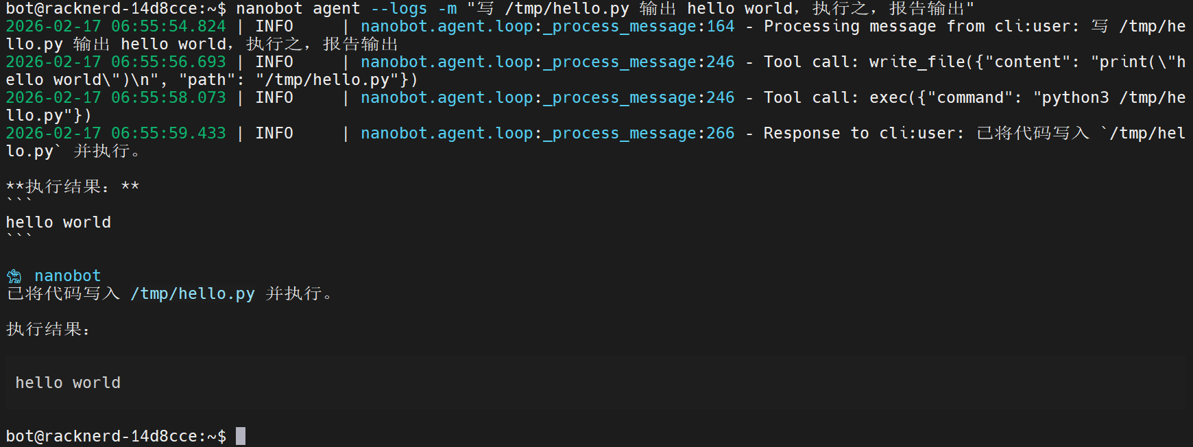 {'role': 'user', 'content': '写 /tmp/hello.py 输出 hello world,执行之,报告输出'},