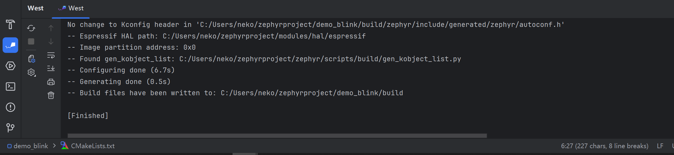 接下来,我们就能用 west 指令实现编译、烧录、调试了,不过要注意它仅在 venv 激活时可用。继续配置 IDE,笔者选择的是 CLion,它原生支持了 Zephyr,参考 Jetbrains 文档和 Zephyr 文档进行配置: