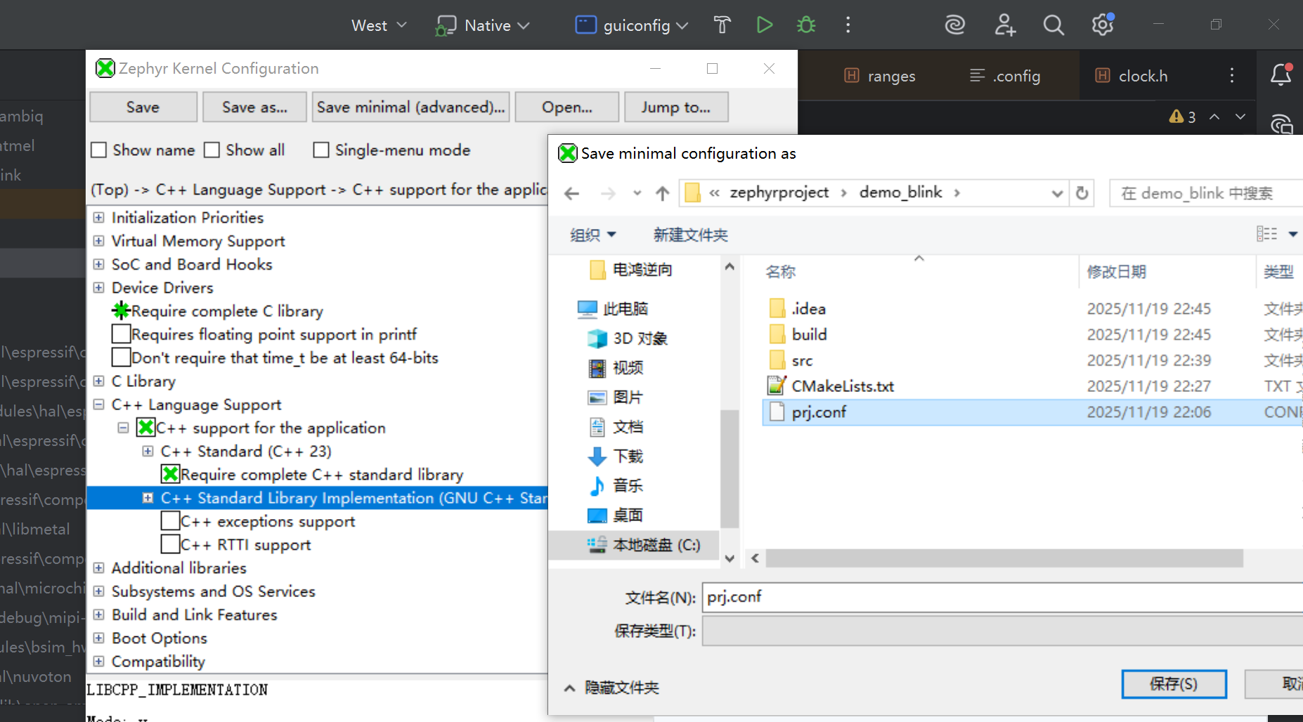 尽管 Zephyr 支持 C++,但我们需要在配置文件中显式地开启。我们构建 guiconfig 这个 cmake target,打开图形界面配置 C++23,并保存到 prj.conf。