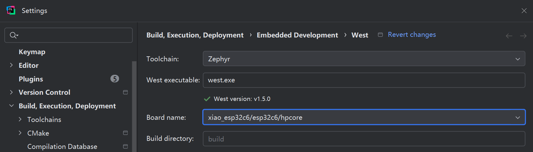 打开 CLion 设置,把 West 的 toolchain 改成之前配置好的 venv 环境,开发板选择 xiao_esp32c6/esp32c6/hpcore 如下: